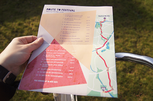 Het festival was niet bedoeld om er met je mobieltje rond te lopen, en op de fiets zou het al helemaal niet goed gaan. Ik wilde wel dat de bezoekers hun behoefte om te delen waar konden maken. Dat heb ik gedaan d.m.v een plattegrond waar ze hun ideeën op konden schrijven. De eindproducten voor dit project waren een plattegrond voor het festival met daarop een infographic, een digitale Engelse fietsinstructie en een bewegwijzeringssysteem.